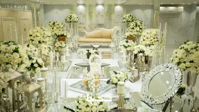 تالار بزرگ پردیس با دقت و هنر خاصی به گلآرایی میز میهمانان پرداخته است. استفاده از گلهای طبیعی و تازه، فضایی شاداب و دلنشین را برای مهمانان ایجاد میکند. گلآرایی با ترکیبی از رنگهای هماهنگ و گلهای فصلی، جلوهای زیبا و بینظیر به میزها میبخشد و با دکوراسیون مجلل سالنها هماهنگی کامل دارد. گلآراییها به گونهای طراحی شدهاند که حس طراوت و زیبایی را به مراسم شما اضافه کنند و تجربهای بهیادماندنی و خاص را برای شما و میهمانانتان رقم بزنند. تیم حرفهای تالار بزرگ پردیس با دقت و ظرافت به تمامی جزئیات گلآرایی پرداخته تا محیطی لوکس و مجلل را برای شما فراهم کند.
