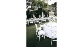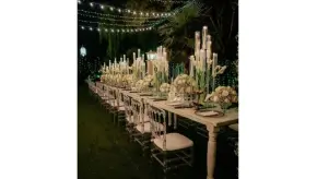 در تالار پردیس جاده شاندیز، گلآرایی میز مهمانان با ترکیبی از سادگی، ظرافت و طراحی لوکس، جلوهای رؤیایی به فضای مراسم بخشیده است. چیدمان میزها در فضای باز این تالار با استفاده از گلهای طبیعی سفید و کرمی، شمعدانهای بلند شیشهای و نورپردازی خطی در بالای میزها، فضایی دلانگیز و باشکوه برای مهمانان ایجاد میکند. طراحی این بخش بهگونهای انجام شده که هارمونی رنگ گلها با تم مراسم عروسی کاملاً هماهنگ بوده و در نور شب جلوهای درخشان به خود میگیرد. استفاده از صندلیهای شفاف و میزهای چوبی روشن، ترکیبی مدرن و در عین حال گرم و صمیمی ساخته که برای مراسم عروسی در مشهد تجربهای متفاوت رقم میزند. تالار پذیرایی پردیس شاندیز مشهد با تیمی حرفهای در زمینه طراحی و گلآرایی، تمامی میزهای مهمانان را با دقت و جزئینگری میچیند تا هر نگاه، پر از حس آرامش و زیبایی باشد. این توجه به جزئیات باعث شده تالار پردیس به یکی از محبوبترین باغ تالارهای عروسی مشهد برای زوجهایی تبدیل شود که به دنبال فضایی خاص و هنرمندانه برای جشن خود هستند.