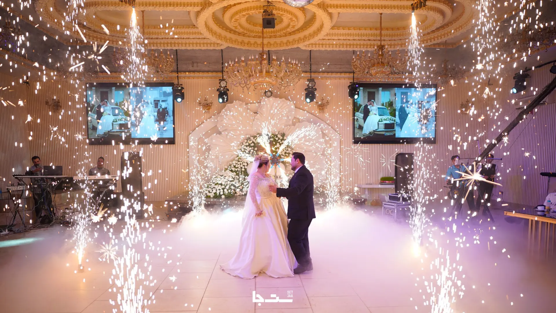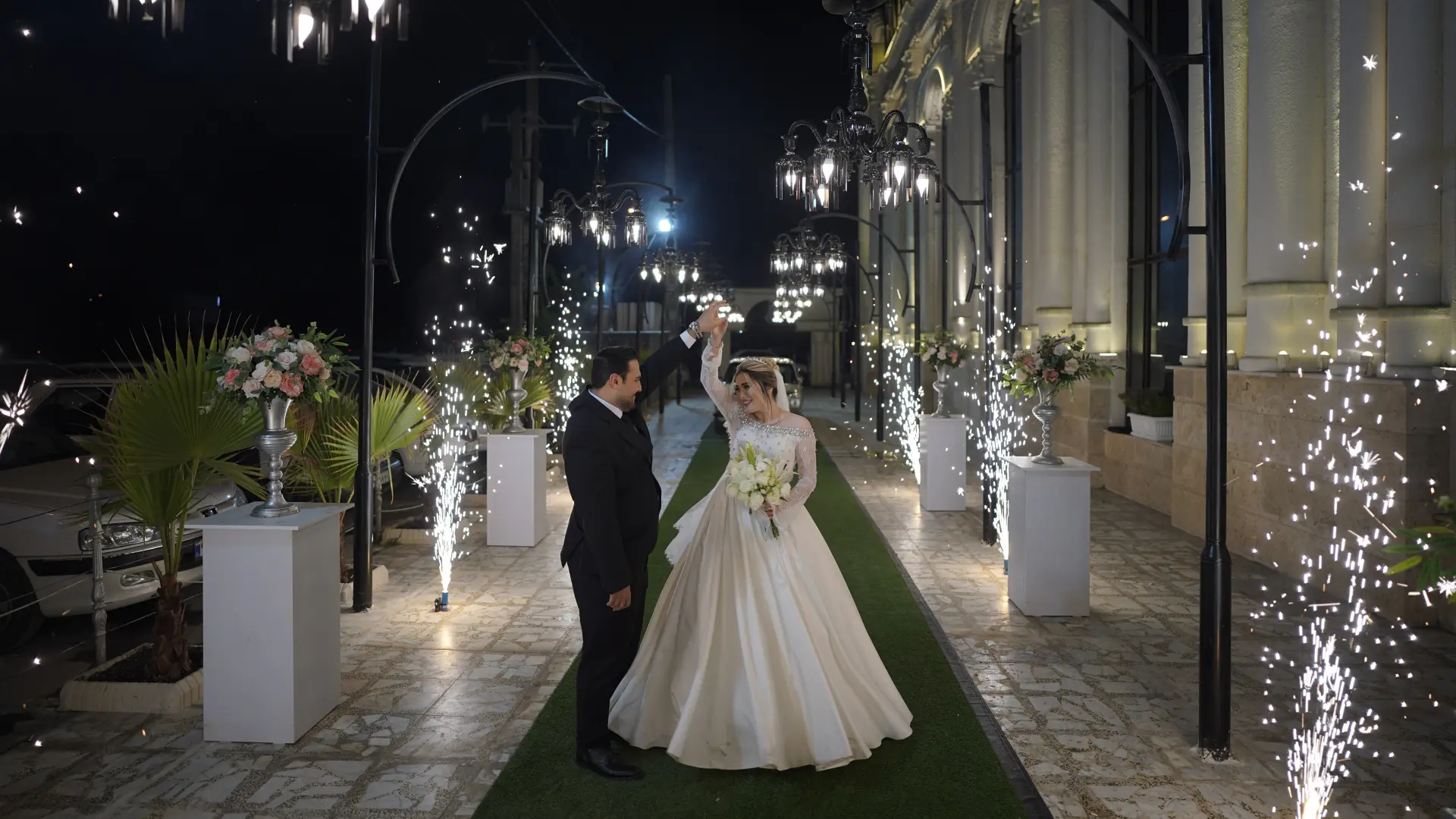 رقص عروس و داماد و آتشبازی در ورودی اولیه تالار